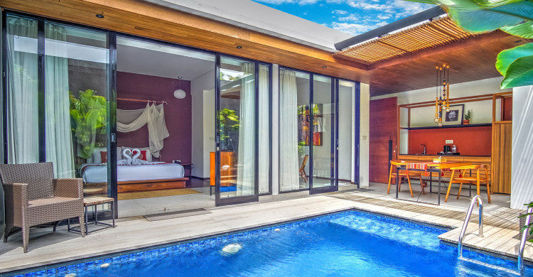 Room Size: 150m2 Pool Size: 7m x 3m with deep 1,4m Bed: 1 x king bed (200cm x 200cm x 35cm) View: Private view Terraces: Balcony and Dining Pavilion Occupants: Maximum 2 Adults + 1 kids (with additional charge extra bed) In-Villa Dining: Available per request