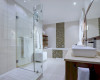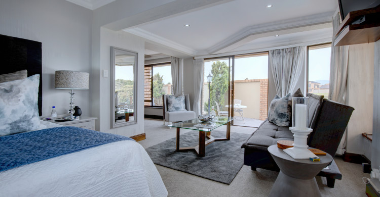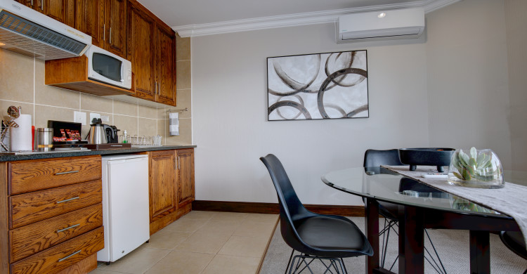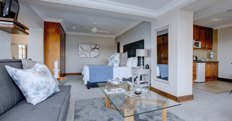 King-size bed Lounge area with a sleeper couch Flat screen TV DVD player Kitchenette Bar-fridge Microwave oven Stove plates Coffee/tea facilities Modern en-suite bathroom with a separate toilet Luxurious amenities and decorations and has its own private patio Air-conditioner Telephone access Electronic safe