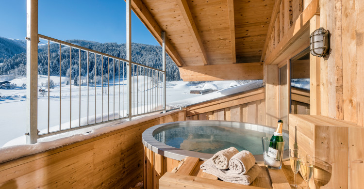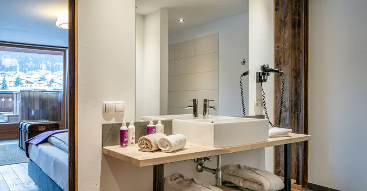 Double room in the Adventure Lodge with view at the valley & the mountains. Cable TV, internet connection, WLAN, shower, WC, balcony, hot pot.1 double bed & the possibility for 2 extra beds, breakfast buffet included, Almlust Spa & indoor pool use, in winter ski room, in summer lake and garden area included.