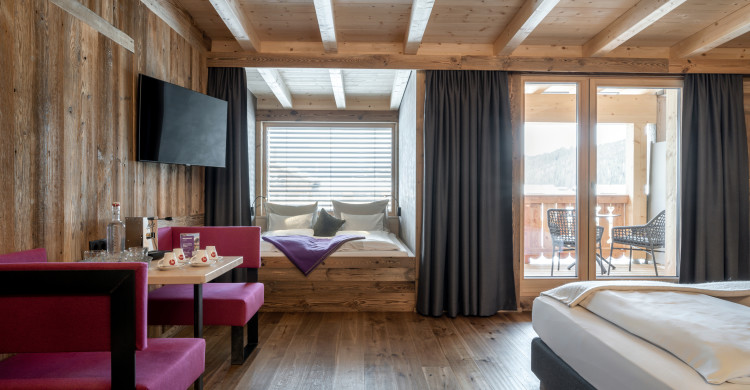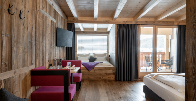 Adventure lodge Double room with cozy star nest in alpine style, open bathroom, dinner table, balcony with a view of the garden and alpine lodges. Free WiFi, cable tv, breakfast buffet, use of Almlust spa & indoor pool, in the winter ski room, in the summer swim lake and garden included. Plus: balcony or bathtub in the room - please let us know which one you prefer!