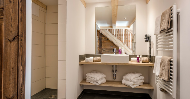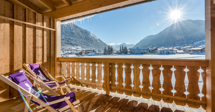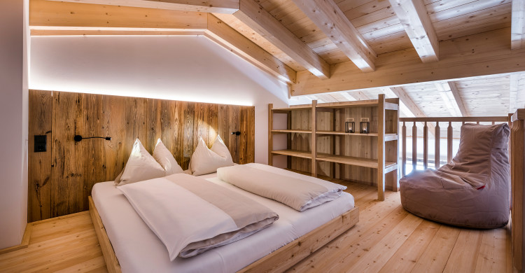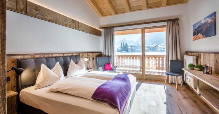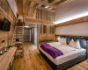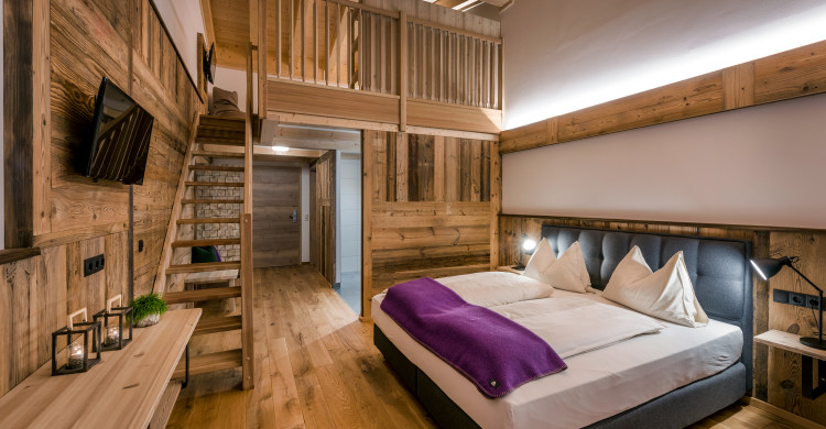 Doubleroom at the adventure lodge & gallery, view to the mountains, cable tv, wifi, shower, wc, balcony, 1 double bed & 1 double bed in the gallery, incl. breakfast buffet, incl. use of spa & pool