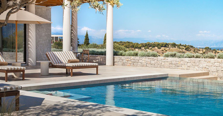 Providing seamless indoor/outdoor living, the 6-Bedroom Villa is surrounded by olive groves overlooking the Aegean Sea. Two full-time members of staff including a chef and a host look after guests in complete privacy.