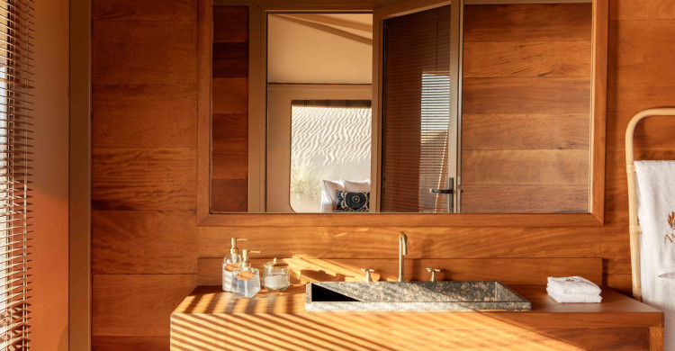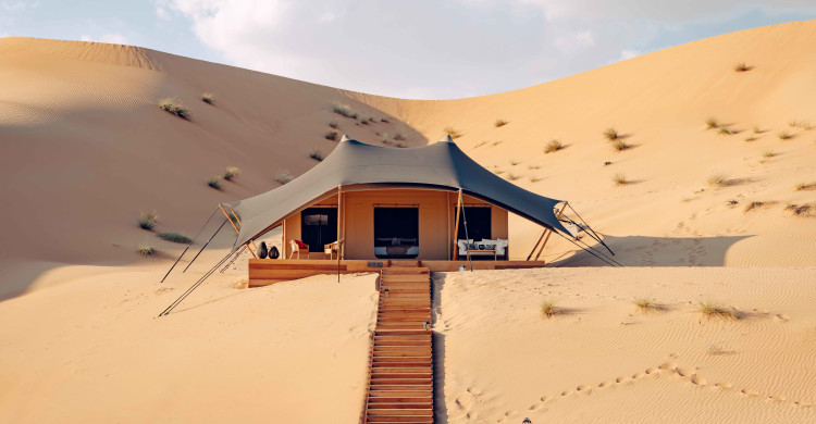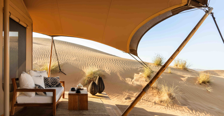 Perched atop an elevated dune, the Deluxe Premium Tent offers breathtaking views of the desert — the perfect spot to witness golden hour or a magical sunrise.