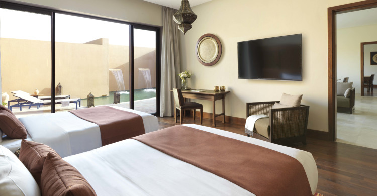 For families and friends who choose to drive to our luxury resort, shaded parking and a VIP entrance stand these villas apart. The sense of prestige continues throughout. A soak in the Jacuzzi and time spent in the pool is refreshed by garden scenery, in absolute privacy. The essence of Arabian culture is reflected in your villa’s elegant décor, the Majlis outside and a personal Villa Host service.