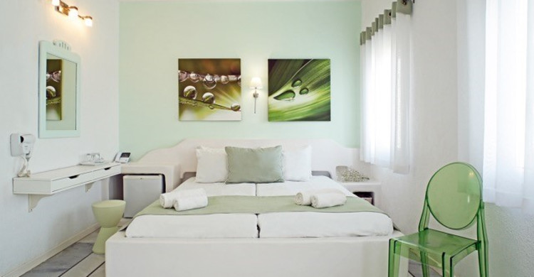 Air condition, stylish minimalistic furniture, mini bar, free wifi, 6-10sq.m. veranda, room service (18hours), Hangers, safe box, satellite T.V., direct phone line, beautiful marble floors, built-in king size bed with a matrimonial or two separated anatomic mattresses, hairdryer, slippers, bathrobe, magnifying mirror, bathroom with large douche, personal care Korres products, set to prepare tea, iron and ironing board.