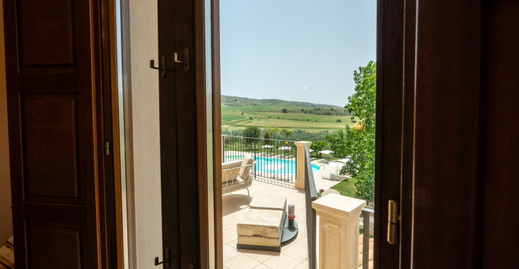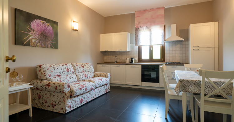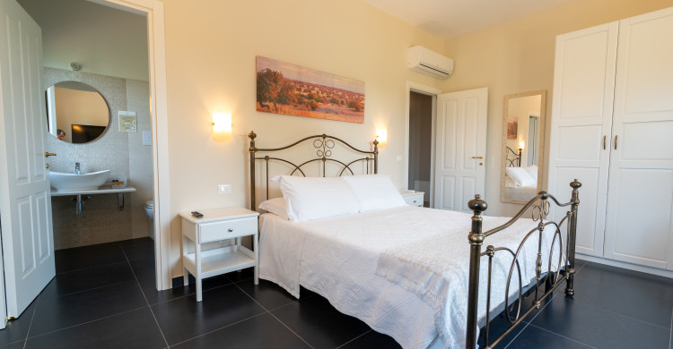 The Monti Iblei apartment, in the Luxury category, accommodates up to 6 guests and features two double bedrooms with en-suite bathrooms and a living room with kitchen and a double sofa bed. From the bedroom, guests can access a private terrace overlooking the swimming pool. The apartment is equipped with a fully fitted kitchen with all necessary appliances, a living area with a double sofa bed and LED TV, and two spacious, bright double bedrooms in classic style, each with a private bathroom featuring a bathtub.