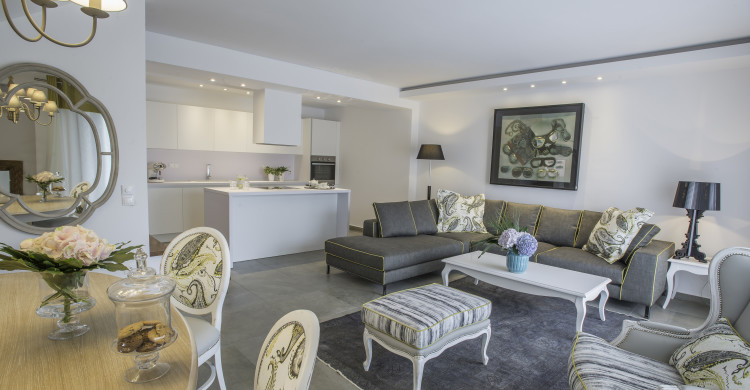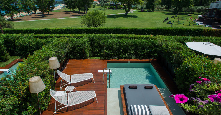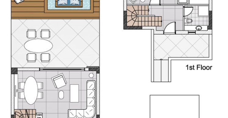 On the ground floor there is a living room with corner sofa, a dining table, an open plan kitchen and a mini bar. In the outdoor area there is a furnished terrace with a private pool with in-build sunbed which tantalize the feeling of relaxation.