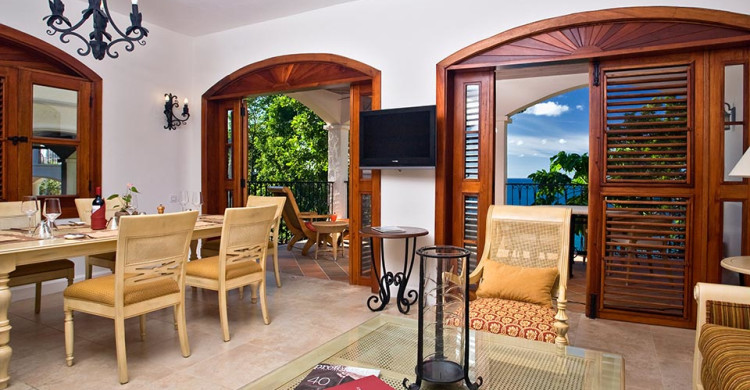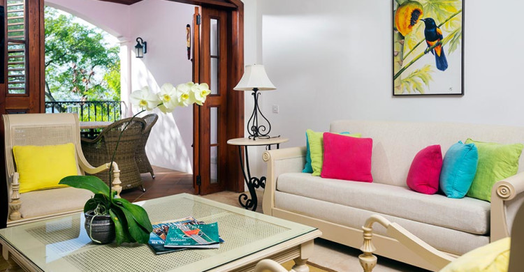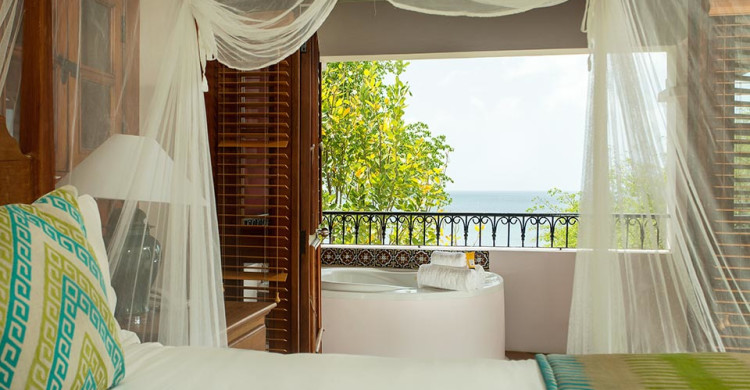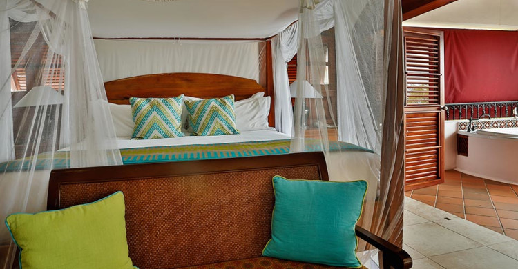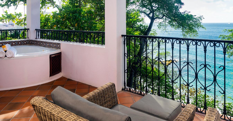 Situated overlooking the Naked Fisherman Beach and surrounded by beautiful tropical gardens, the views out to Martinique over the blue Caribbean Sea are spectacular. Large split level suites, they come with a downstairs living/dining area with private verandah and upstairs a four posted king size bed, walk in wardrobe and an outside private whirlpool tub on the balcony.