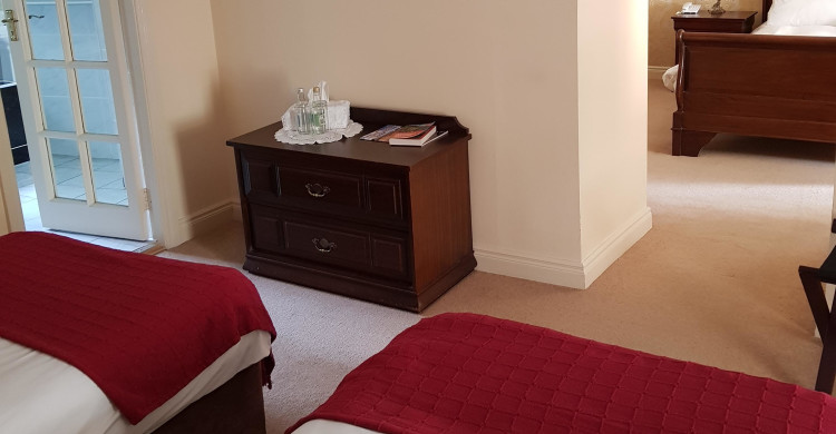 Family-Ensuite- Courtyard bedroom has two spacious bedrooms with an adjoining bathroom. A queen sized double bed and two single beds, crisp white bed linen, flat screen TV, hairdryer, telephone, alarm clock and toiletries. The modern en-suite has both a jacuzzi bath and a separate shower facility. Complimentary tea / coffee served upon arrival and throughout stay in one of our front drawing rooms. Complimentary Wi-Fi. Located on the 1st floor in The Courtyard. The house does not have a lift.