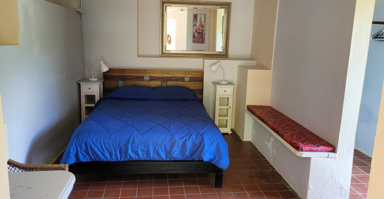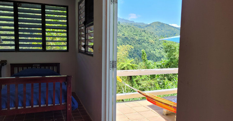 This ground level private room is very spacious. It has one queen bed and one twin bed. Private bathroom with hot water shower. With a tiled corner terrace area, perfect for lounging in your hammock with breathtaking views. The nightly rate is $170