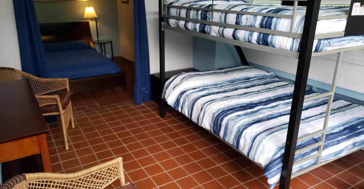 This room is on the middle level of the main Casa Cubuy Ecolodge. It has one queen bed, one double bed, and one twin bed. Private bathroom with hot water shower. With sliding glass windows that face the forest with all day panoramic views. The nightly rate is $180