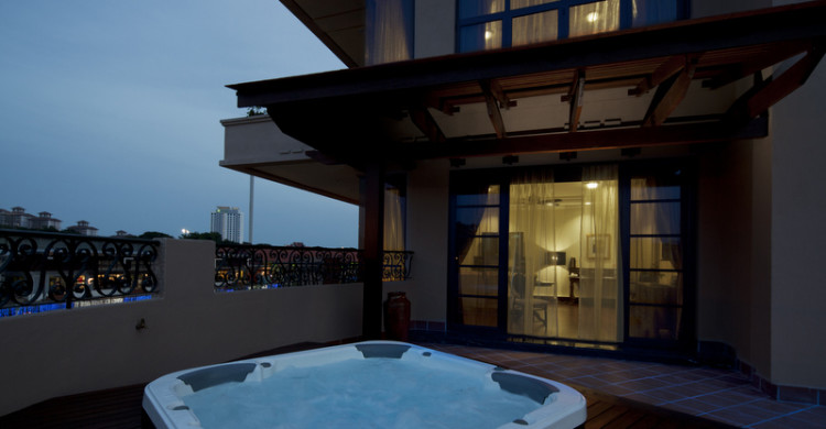Melaka Suite also a two-bedroom suite, master bedroom with king-sized bed & guest bedroom with twin bed. It also features an outdoor courtyard with a jet bubble bath and outdoor dining set. (131 sqm).
