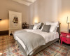 A spacious and quiet twin deluxe suite enjoying high ceilings and intricate warm coloured restored Maltese original floor tiles. (30.5 sqm). Yet another exceptional Ritty Tacsum panoramic wall paper feature drapes the walls of the shower ensuite facilities. The shower consisting of Frammenti mosaic cladding by also has GESSI mixers and a TUBES towel warmer. This suite enjoys luxurious soft bed linen and has pretty courtyard views from the balconies. This room has the possibility of being interconnected to suite 5 ideal for families travelling with kids or a group of friends. A gorgeous lime green Ritchie sofa stands out and adds a classic style to the room.