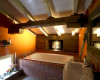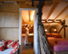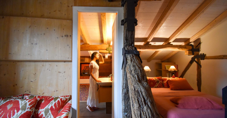 Spacious and romantic, with warm-toned furnishings in shades of orange, red, and coral. Ancient exposed beams, sunlight filtering through the skylight, and a window opening onto the hills. The living area can be transformed into a bunk bed for two children (up to 10 years old). The whirlpool tub in the bathroom completes your relaxing stay.