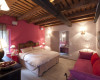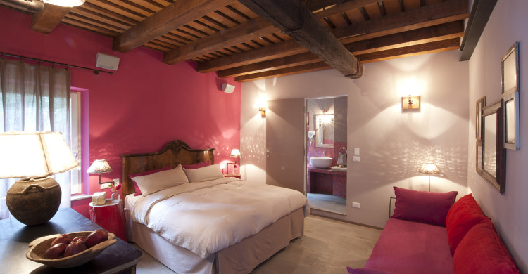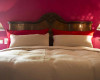 A spacious double room where ruby tones prevail and a delicate scent of talc fills the air. The embrace of a timeless bed, original red-lacquered bedside tables made from tree trunks, an antique chest of drawers, and a comfortable dormeuse that can be converted into an extra bed. The garden view, together with a bathroom featuring a large shower, Turkish bath, and chromotherapy, add uniqueness and comfort to your stay.