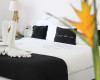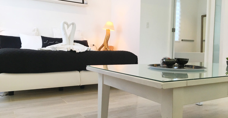 White, black , clean and serene! Welcome to our Mystique suite of 60m2 with inside balcony & small outside terrace. This suite has all the comfort you need! Comfortable Auping bed with Egyptian cotton linen, selection of different pillows, a desk with chair, sofa & table,high definition television and DVD player, espresso machine, Bose SoundTouch, aromatherapy diffuser with mood light, automatic blackout curtains, separate dressing, mini bar, safe, fans, silent air conditioning, alarm clock, bathroom with bath and shower, sink and toilet.