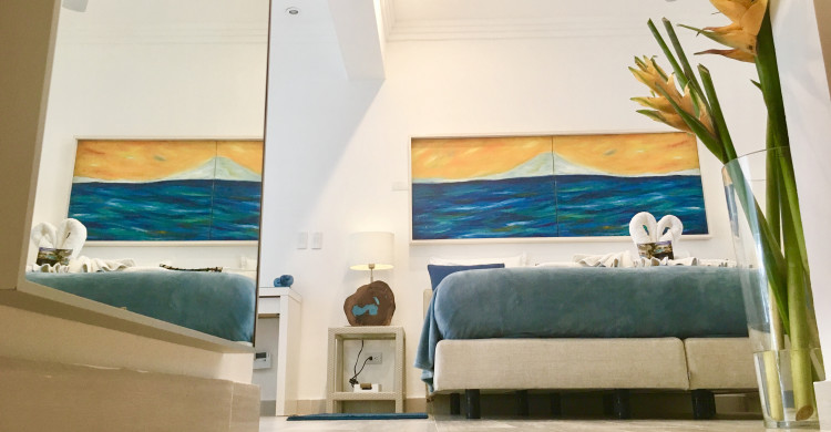 Comfortable Auping bed with Egyptian cotton linen, selection of different pillows, a desk with chair, sofa & table, 49” smart television, WI-FI, espresso machine, Bose SoundTouch, aromatherapy diffuser with mood light, beach bag with beach towels, umbrella, full length mirror, automatic blackout curtains, separate dressing with mini bar and extra sofa, safe, fans, silent air conditioning, alarm clock, bathroom with walk-in shower, sink and toilet, bathroom amenities, make-up mirror, bathrobes and slippers.