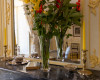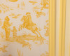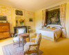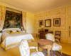The walls are covered in mustard golden Toile de Jouy fabric, the room has precious XVIIIth century antiques and large Aubusson tapestry, a fireplace with a trumeau plus a large window overlooking the garden and park.