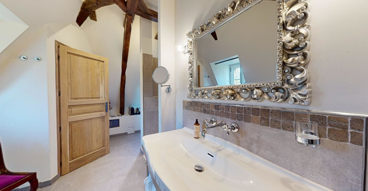 Our Flora room is on the second floor of the château, in the west wing. A spacious room, bathed in light. Flora, goddess of spring, of flowering, protector of nature and gardens, inspired us to create this luminous decoration. Touches of green, purple, bright colours on the wall, welcome to a world where everything blossoms.
