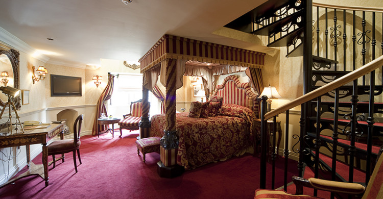 Warm crimson and glimmering golds come together to bring The Chamberlain room to life. Relax with a book on the regal four-poster bed, or wander up the spiral staircase to the roll top bath, where you can unwind after a day of exploring Warwickshire's beautiful countryside.