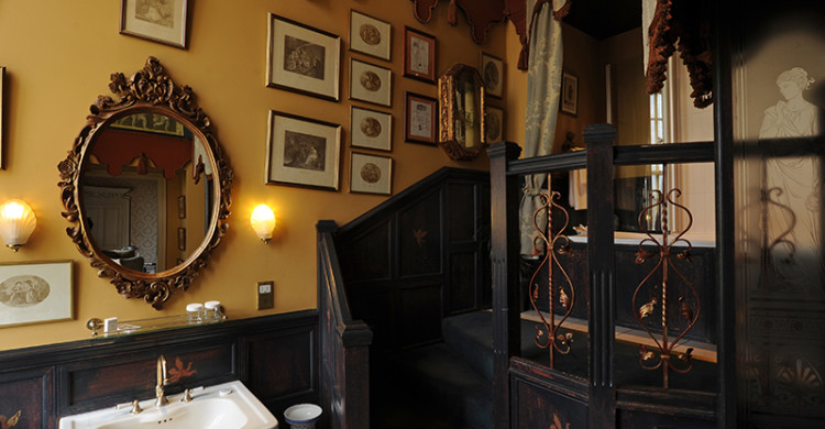 The bathroom is split into two levels, and features an enormous bath, with draped silk golden curtains. It’s certainly the epitome of style and elegance.