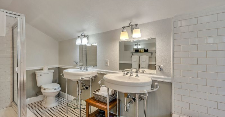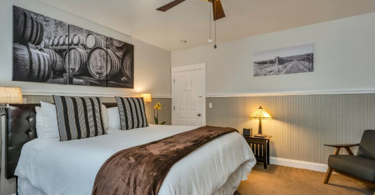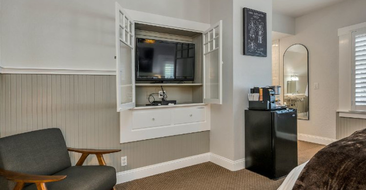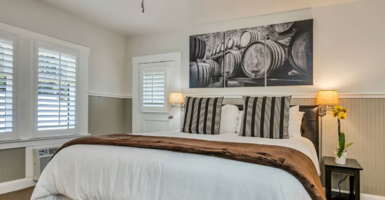 Retreat to the Diamond Room at the Craftsman Inn, a romantic sanctuary on the north side of the inn where elegance and comfort blend seamlessly. This luxurious space features a plush, pillow-topped king bed, perfect for a peaceful escape. Step onto your private upstairs porch to sip a glass of Napa Valley wine while soaking in the tranquility of the surroundings.