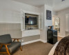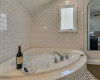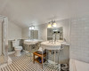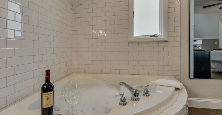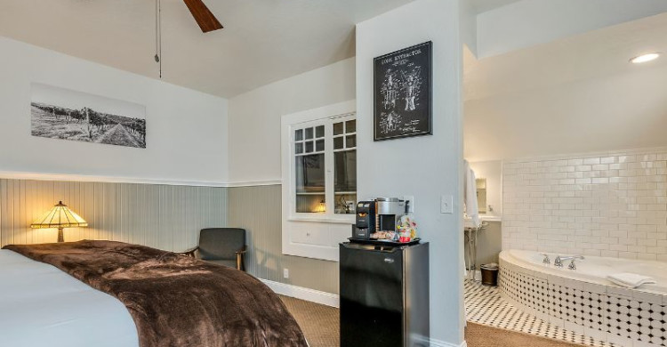 The beautifully designed bathroom boasts vintage charm with a corner jetted tub, dual sinks, and a spacious separate shower, all accented with timeless tiling. Thoughtful amenities, including an in-room refrigerator, coffee machine, and complimentary snacks and bottled water, ensure every detail is taken care of for a truly relaxing stay.