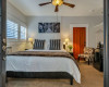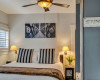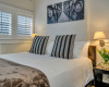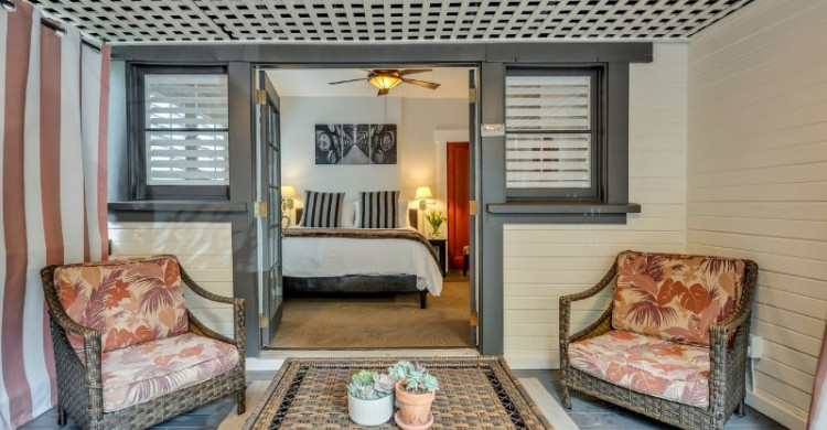 Inside, French doors open to a sunlit space featuring original swing windows, offering a perfect balance of natural light and romantic ambiance. Unwind with a cozy movie night on the large flat-screen TV or simply savor the quiet moments together.