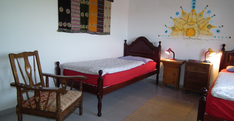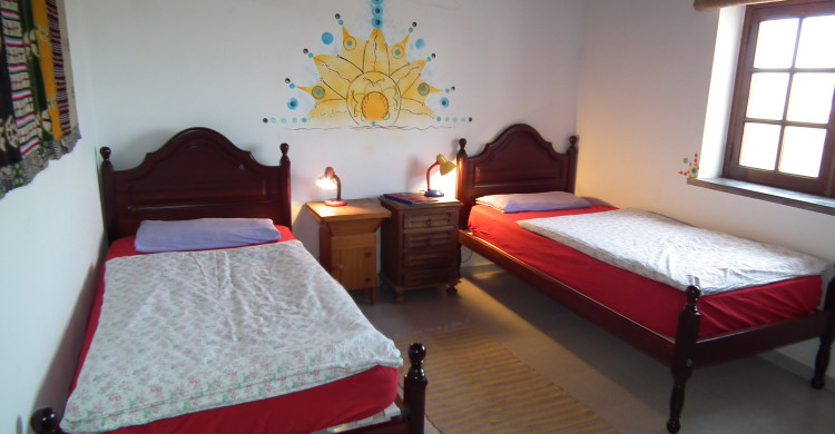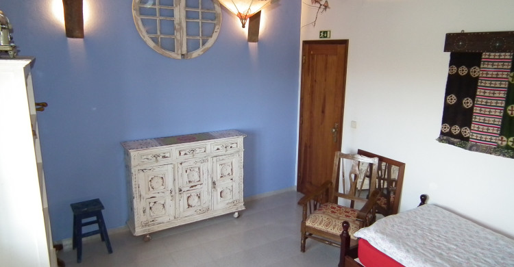 The double room on the first floor of the main house can be reached via the internal staircase from the kitchen or the fireplace room. The room has two single beds, which can also be pushed together to form a double bed. If necessary, a cot can also be added. The window offers a great view over the wide landscape to the opposite village Zambujeira. The bathroom with shower on the ground floor is shared with guests staying in the other two rooms on the first floor. In the room with the fireplace, however, there is a guest WC for urgent cases.
