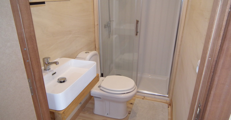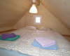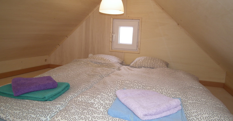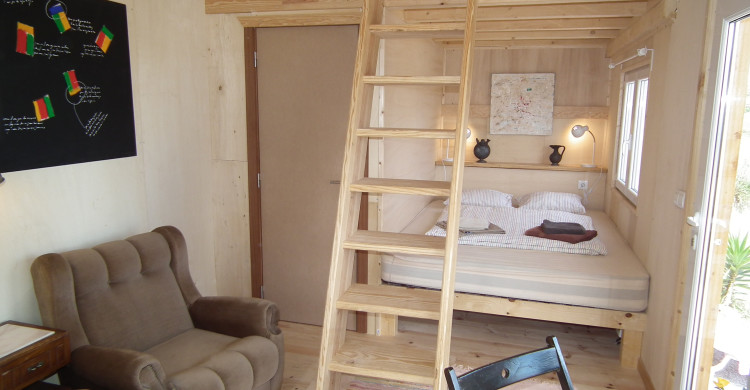 The “Tinyhouse Eloá” offers a small kitchenette, refrigerator, bathroom with toilet and shower, and wonderful view over the wide countryside to the opposite villages, above which the sun rises in the morning and shines directly into the bedroom. Sleepy people should therefore draw the curtains before going to sleep.