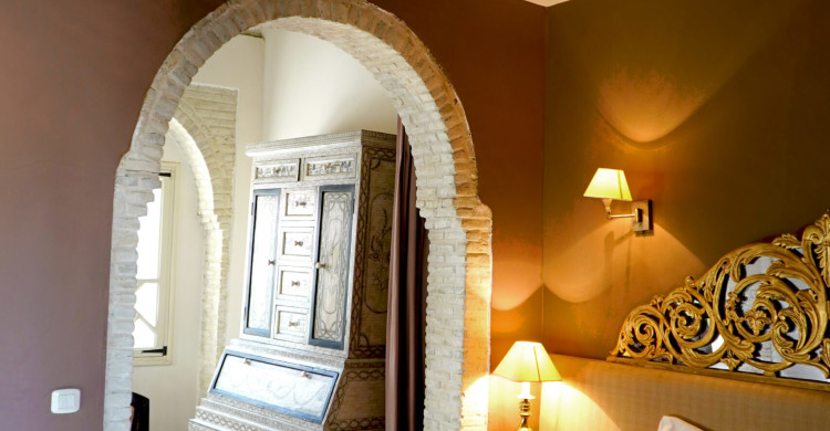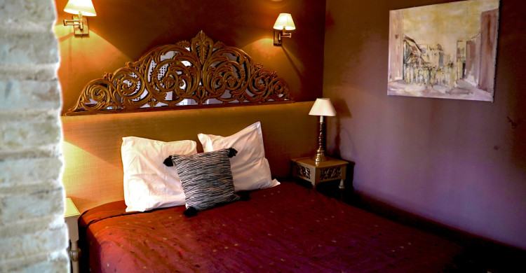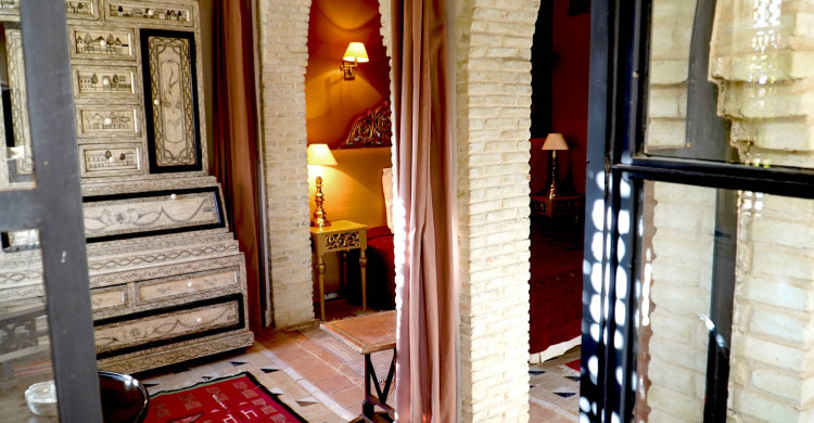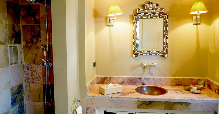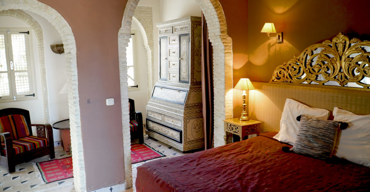 This suite opens directly onto an anteroom enhanced by its typical Tozeur wardrobe. Opposite the entrance is the bedromm with king-size bed. The room's windows provide plenty of natural light during the day. The en suite bathroom has a walk-in shower, a spacious washbasin and a toilet. A private terrace completes this intimate suite.