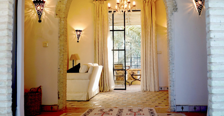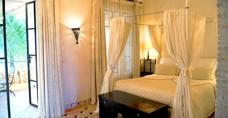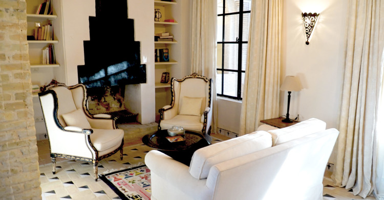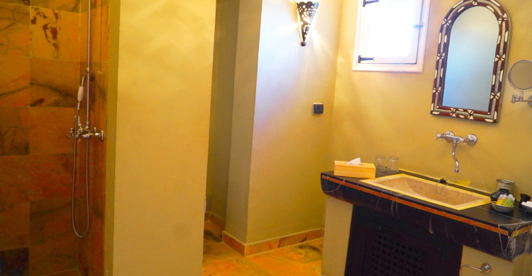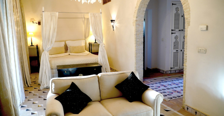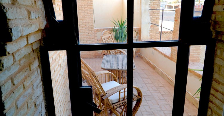 On the first floor of the riad, this pretty suite has a beautiful fireplace facing a double bed and a separate study offering an exceptional view of the Tozeur medina and its palm grove through a large bay window. Large bathroom with walk-in shower. The biggest suite of Dar Tozeur.