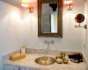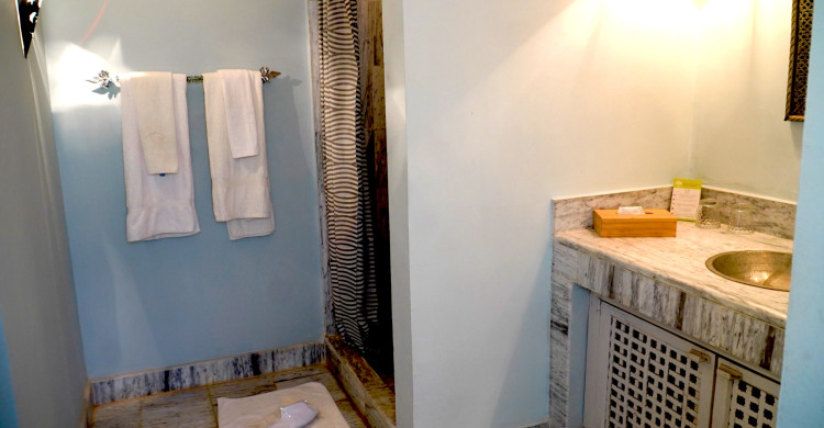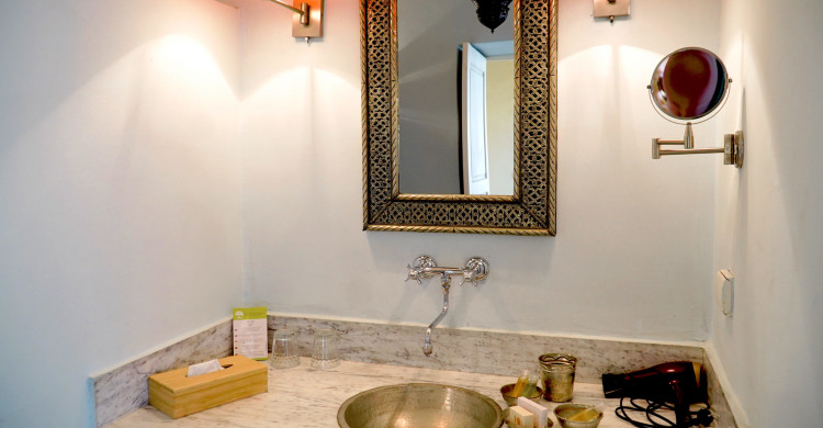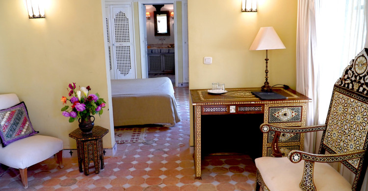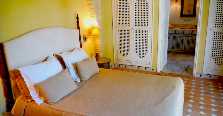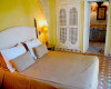 On the first floor, this suite comprises an anteroom/office with a typical fireplace decorated with local mosaics. Windows overlook the courtyard and its flower-filled garden. The queen-size bed is overlooked by a magnificent dome with magical lighting. The en suite bathroom has a washbasin, walk-in shower and toilet.