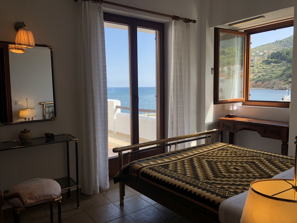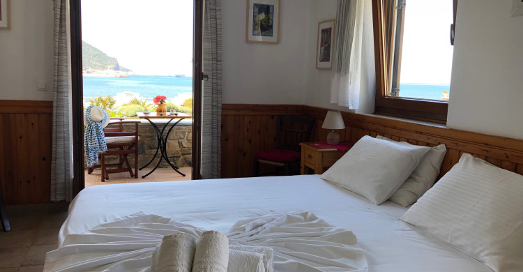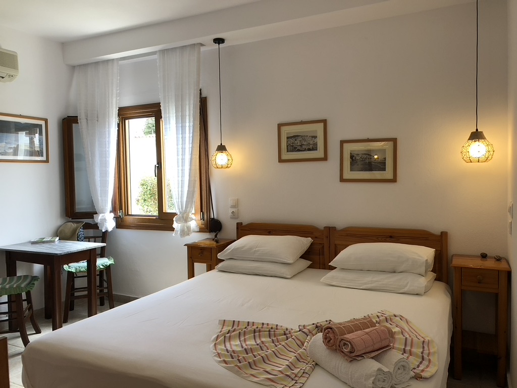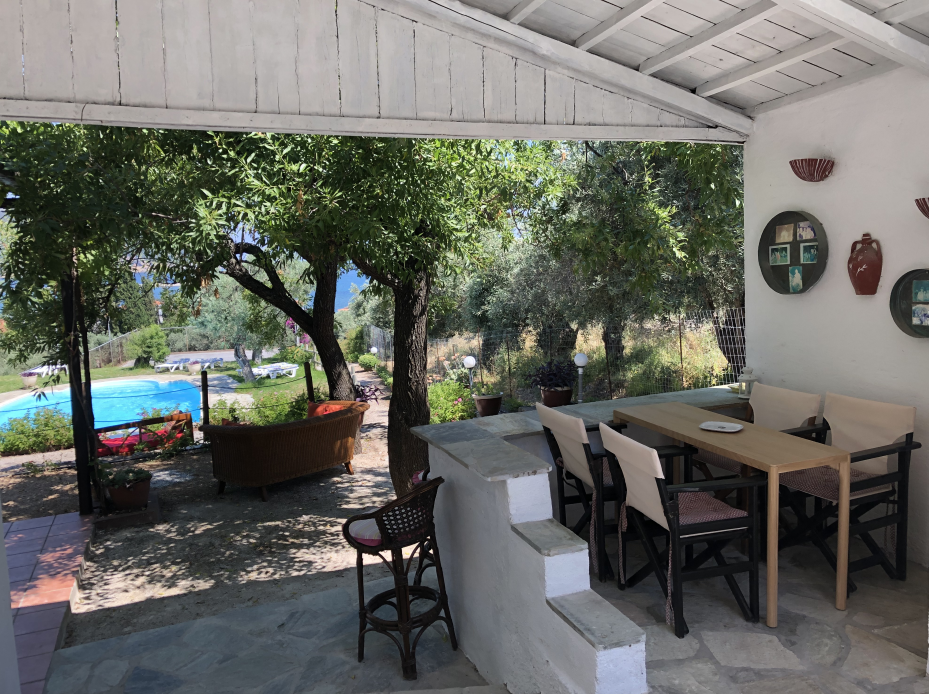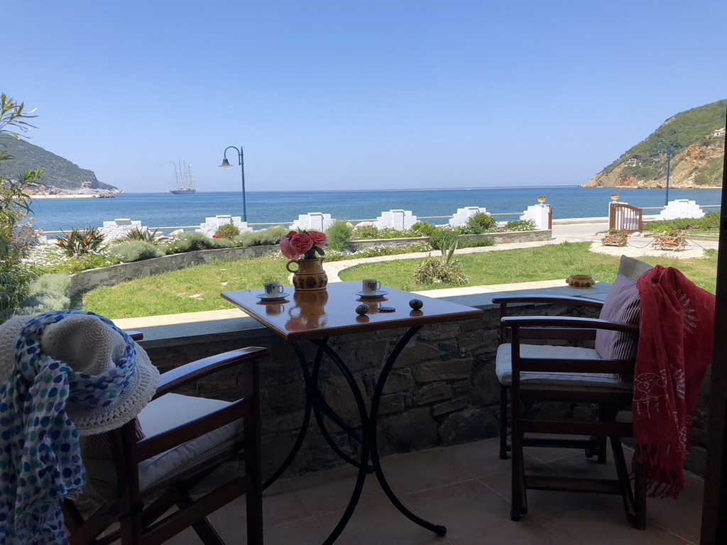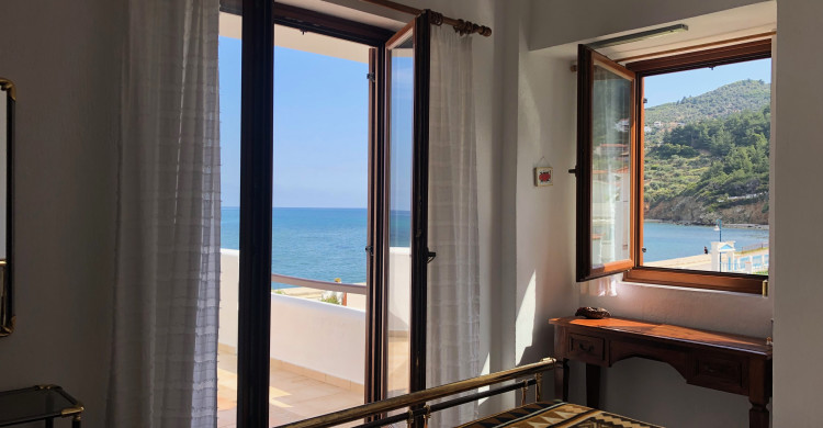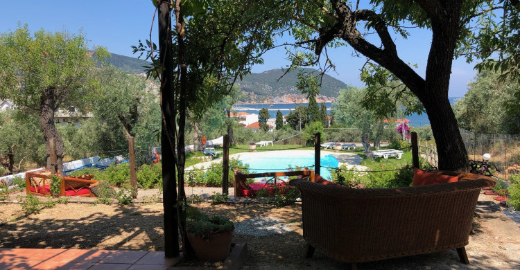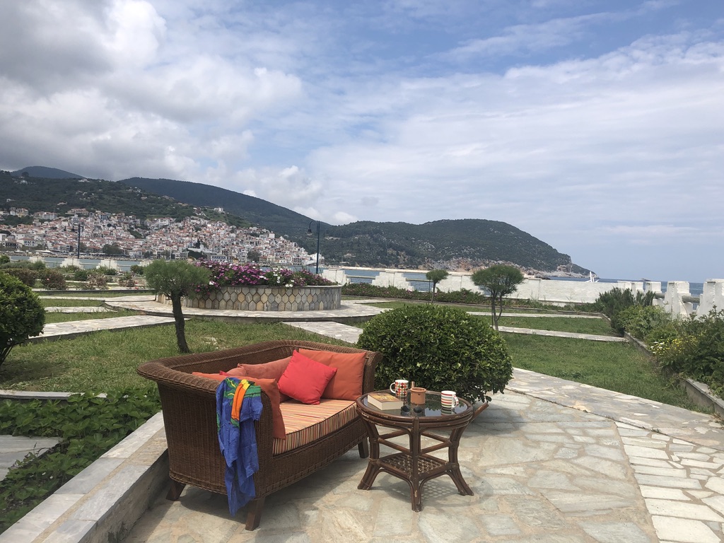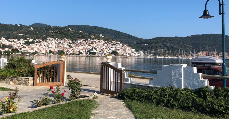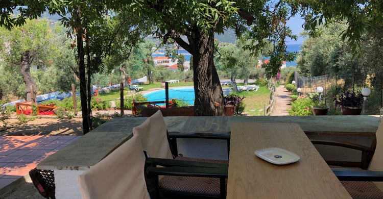 Tucked into a serene olive grove just 700 meters from the port of Skopelos, we are a small resort located in Skopelos town (700m from the main port of Skopelos). Our premises are situated on a gentle slope of a 300-meter hillside and occupy a 7000m2 of olive grove land. Our three, main accommodation buildings are located at the lower part of our premises. The tennis court and swimming pool with plenty of sunbeds are towards the back, set amidst our gracious Olive trees and away from it all for the exclusive use of our clients. The main entrance is literally a stone’s throw from the water’s edge. It is a combination of apartments and studios. Our stunning view across the harbour entrance and the Aegean Sea beyond will relax and rejuvenate you. The pine-covered slopes of mount ‘Palouki’ tower over our premises, creating the perfect combination of Green on Blue.