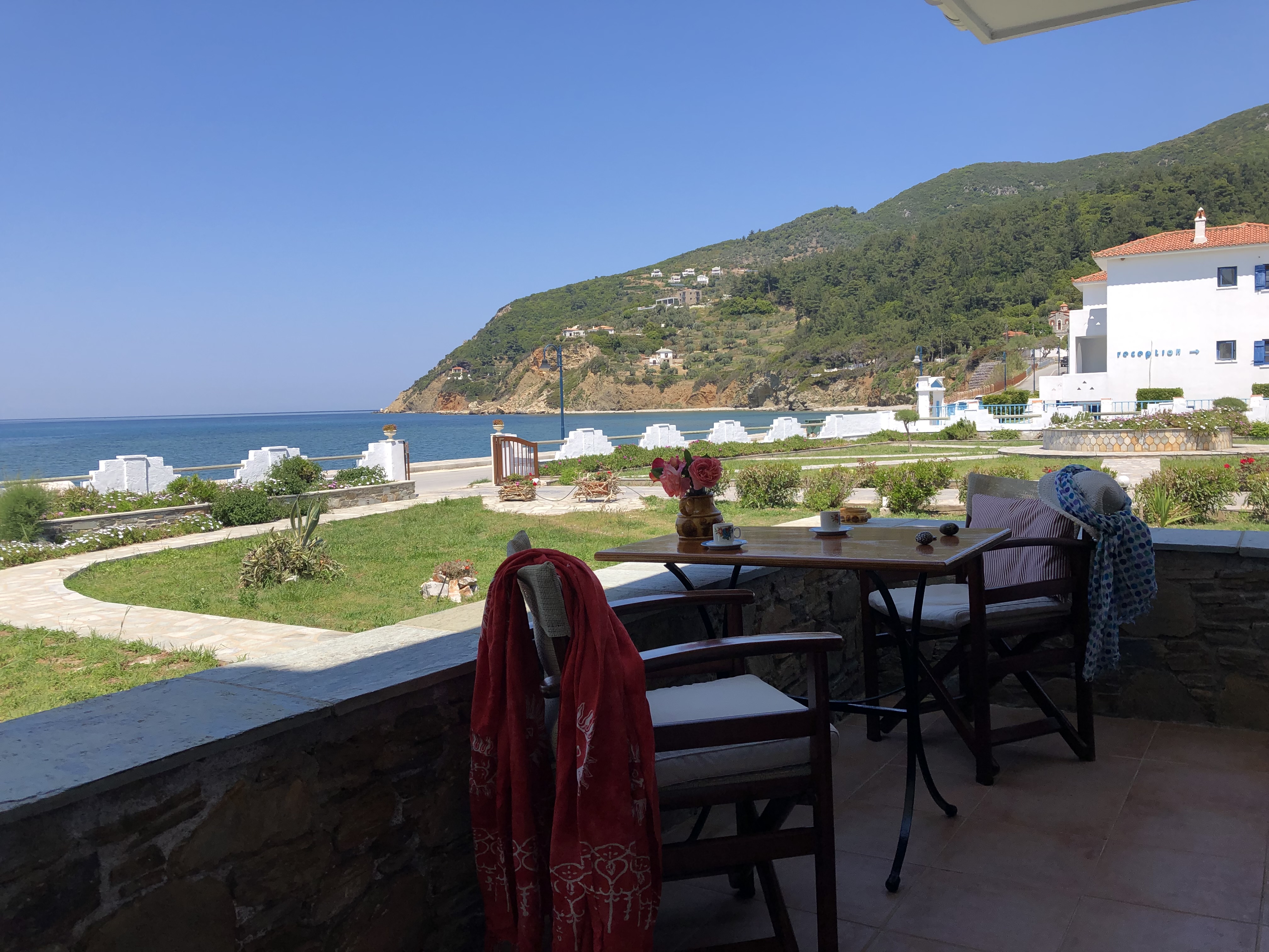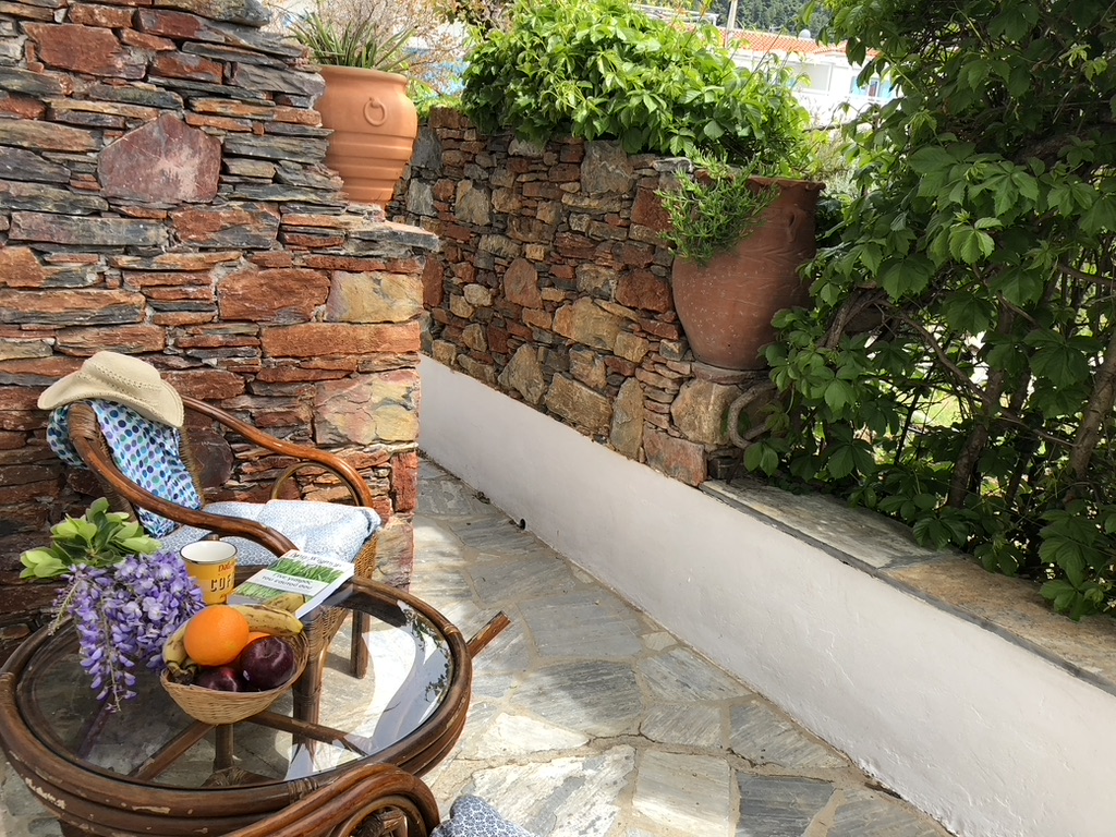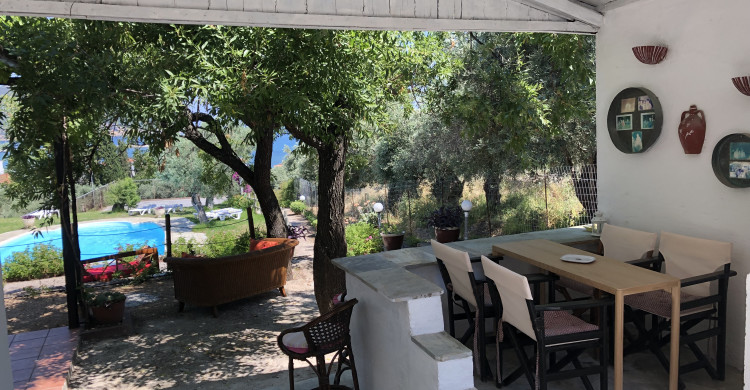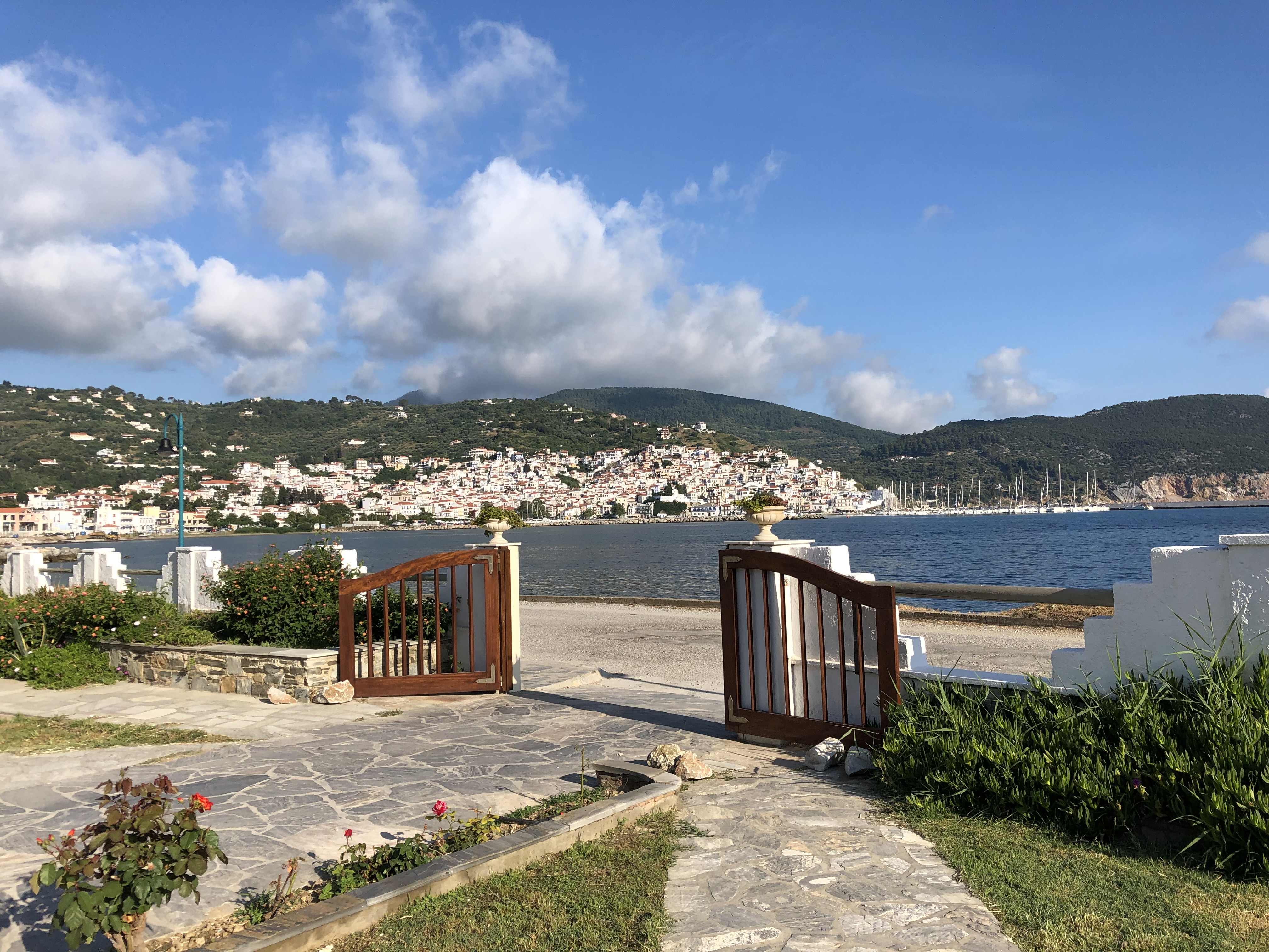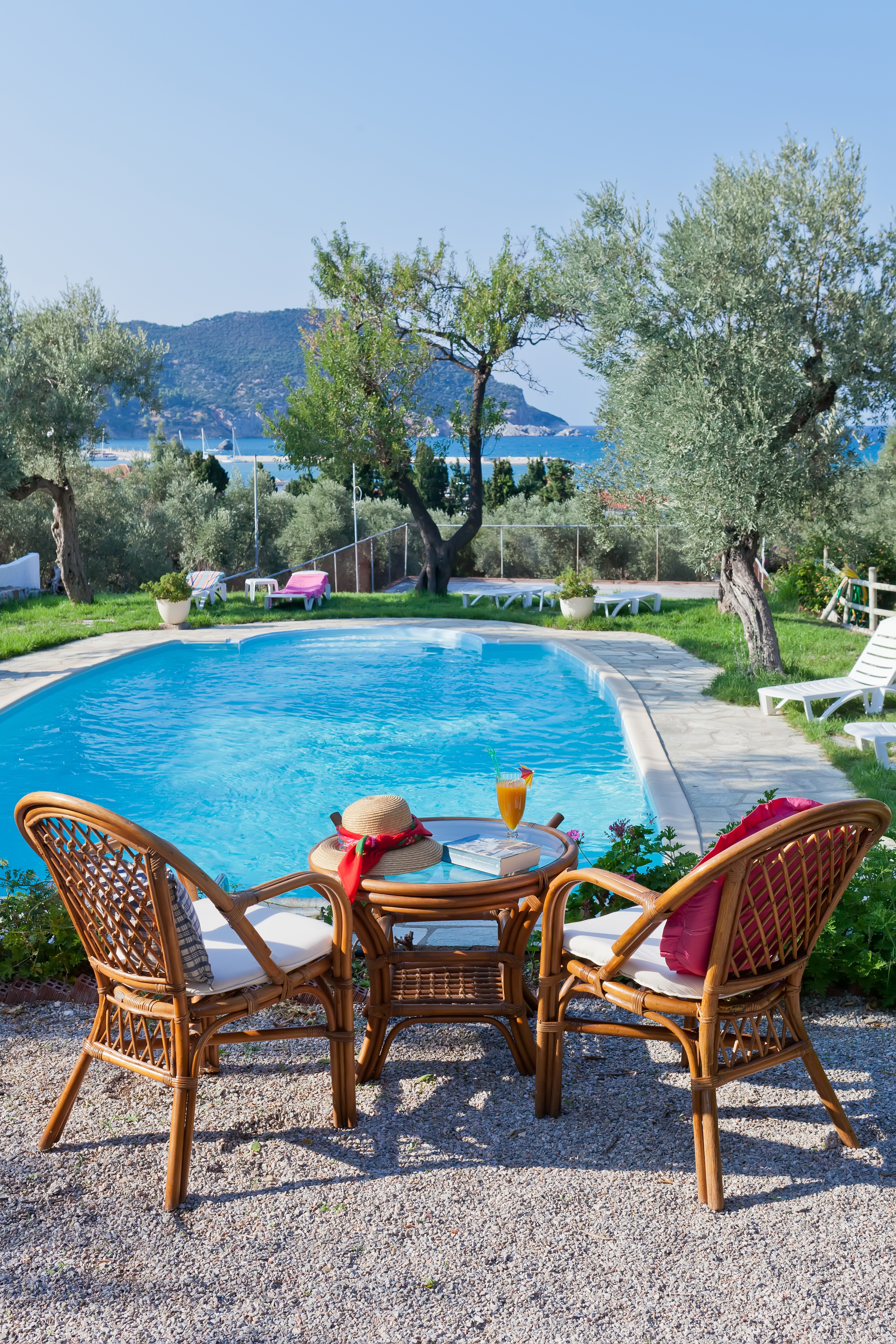 Tucked into a serene olive grove just 700 meters from the port of Skopelos, we are a small resort located in Skopelos town (700m from the main port of Skopelos). Our premises are situated on a gentle slope of a 300-meter hillside and occupy a 7000m2 of olive grove land. Our three, main accommodation buildings are located at the lower part of our premises. The tennis court and swimming pool with plenty of sunbeds are towards the back, set amidst our gracious Olive trees and away from it all for the exclusive use of our clients. The main entrance is literally a stone’s throw from the water’s edge. It is a combination of apartments and studios. Our stunning view across the harbour entrance and the Aegean Sea beyond will relax and rejuvenate you. The pine-covered slopes of mount ‘Palouki’ tower over our premises, creating the perfect combination of Green on Blue.