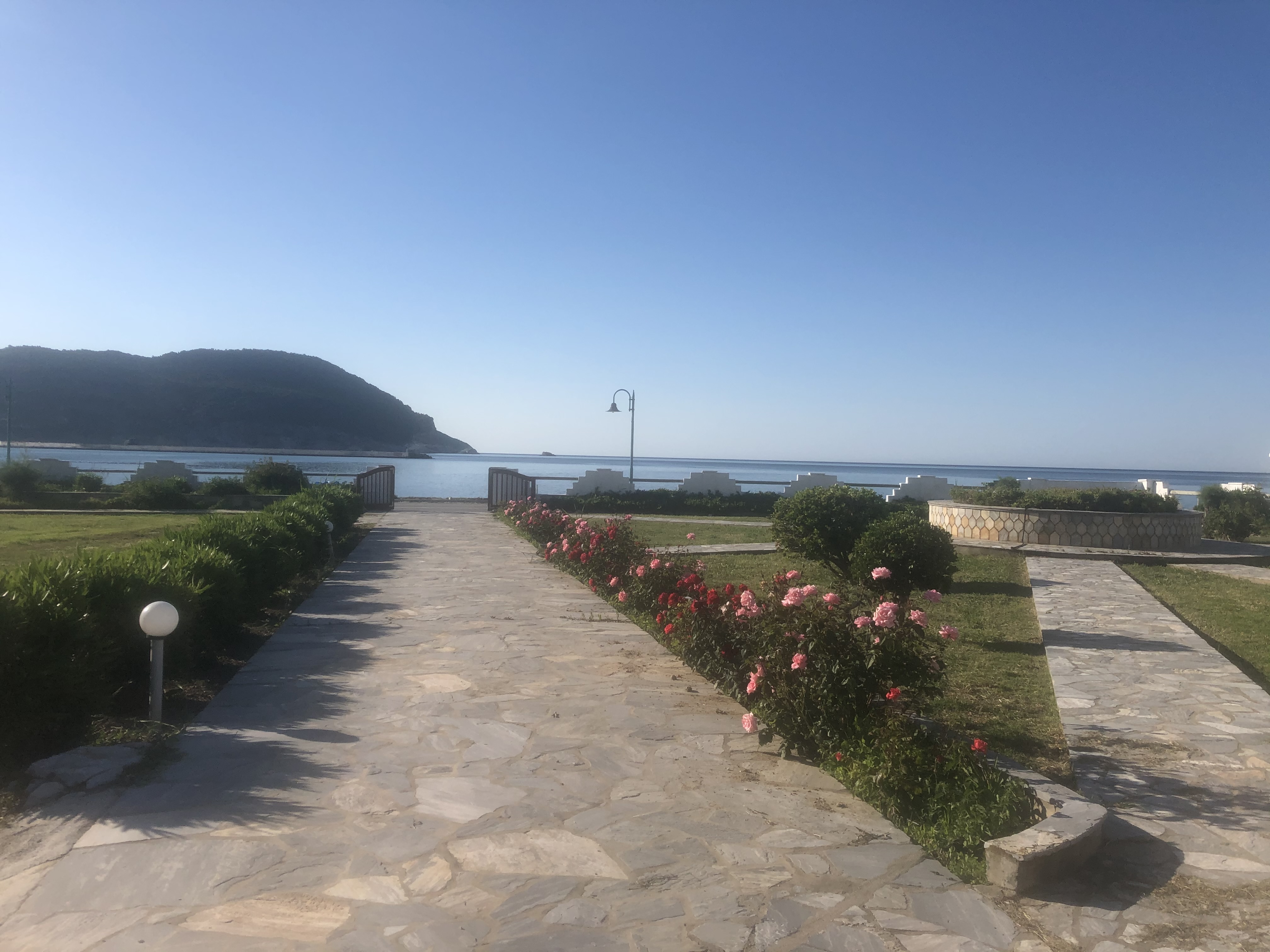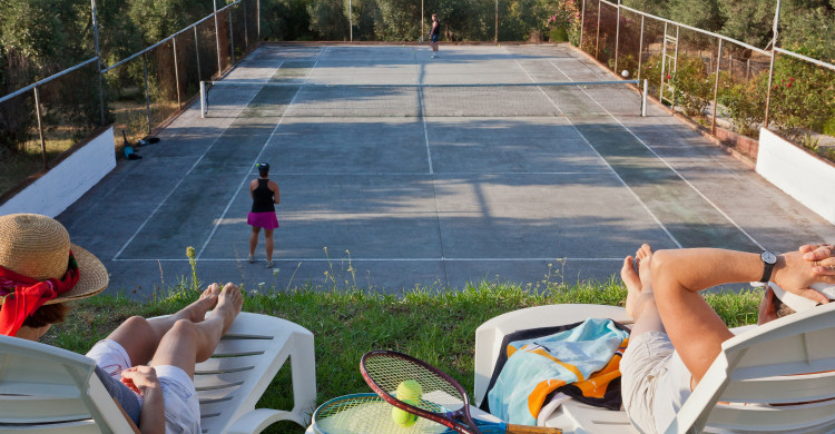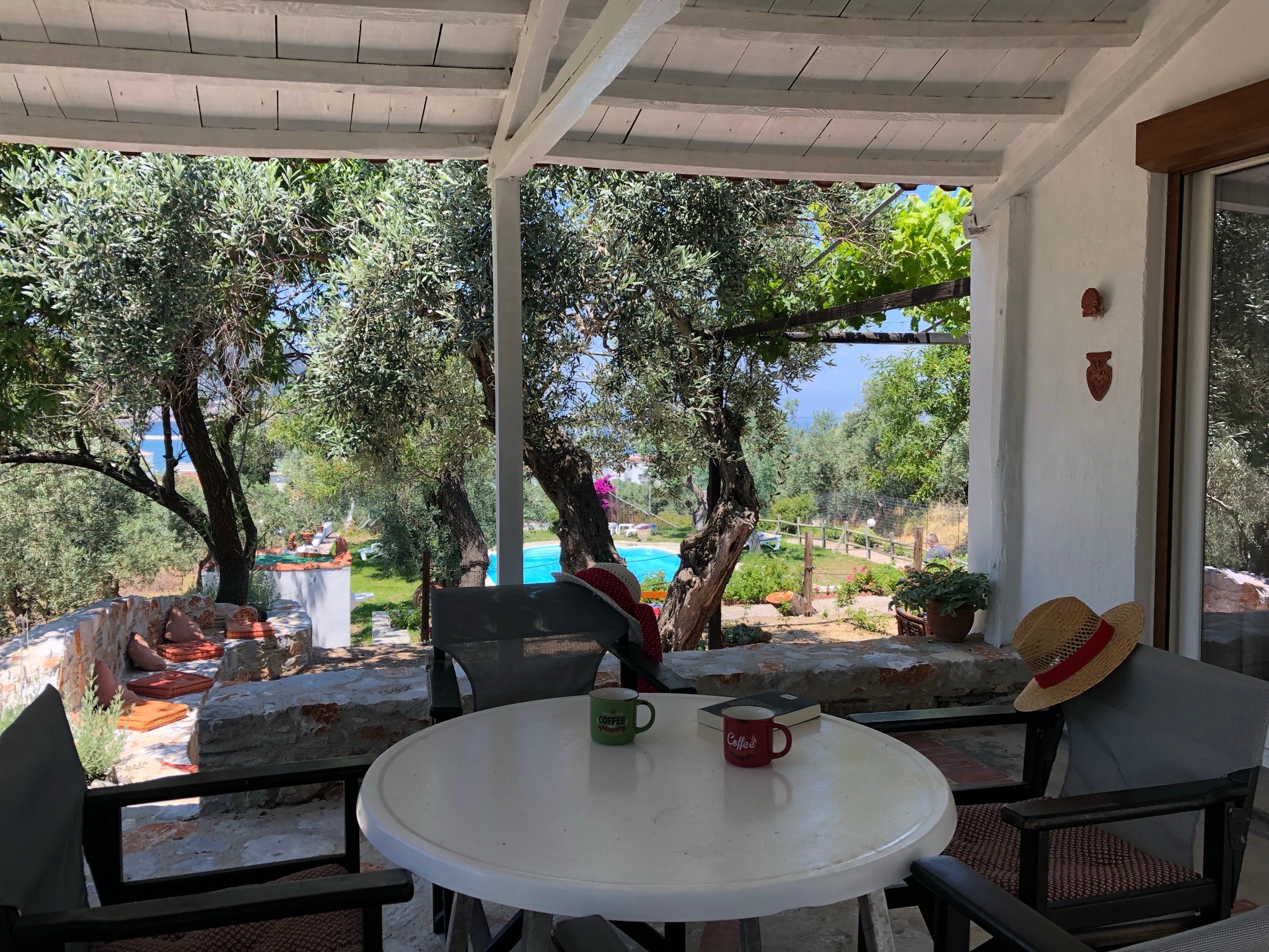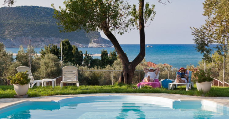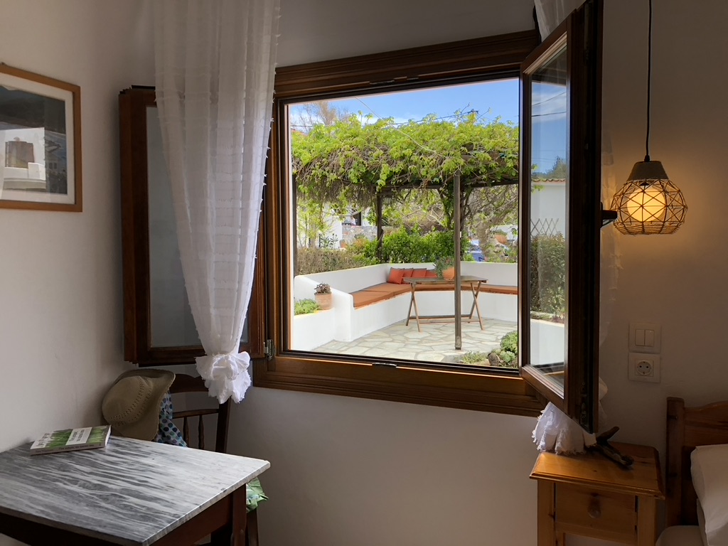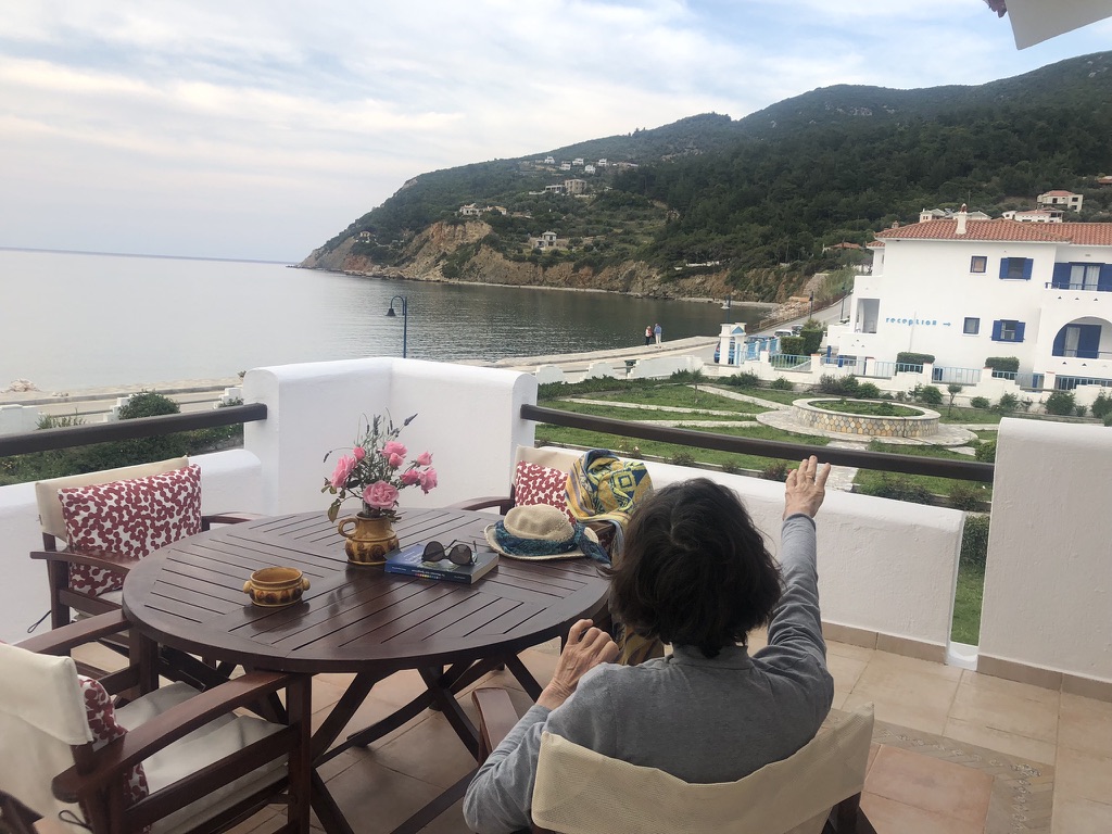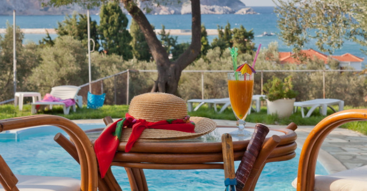 Tucked into a serene olive grove just 700 meters from the port of Skopelos, we are a small resort located in Skopelos town (700m from the main port of Skopelos). Our premises are situated on a gentle slope of a 300-meter hillside and occupy a 7000m2 of olive grove land. Our three, main accommodation buildings are located at the lower part of our premises. The tennis court and swimming pool with plenty of sunbeds are towards the back, set amidst our gracious Olive trees and away from it all for the exclusive use of our clients. The main entrance is literally a stone’s throw from the water’s edge. It is a combination of apartments and studios. Our stunning view across the harbour entrance and the Aegean Sea beyond will relax and rejuvenate you. The pine-covered slopes of mount ‘Palouki’ tower over our premises, creating the perfect combination of Green on Blue.