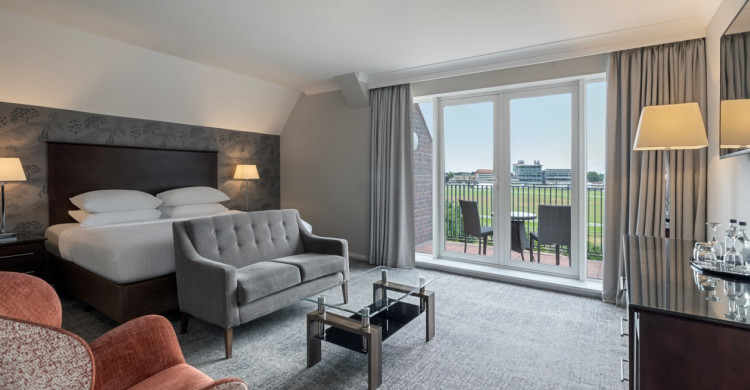 York Racecourse takes centre stage from our Grandstand Room, where floor-to-ceiling windows and doors open onto your private balcony/patio. This expansive hotel accommodation offers thrilling views of the track outside, while inside, a large bathroom boasts a separate shower and bath tub for relaxing. Luxury bedding is also standard in all our hotel guest rooms, along with high-speed internet access.