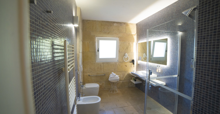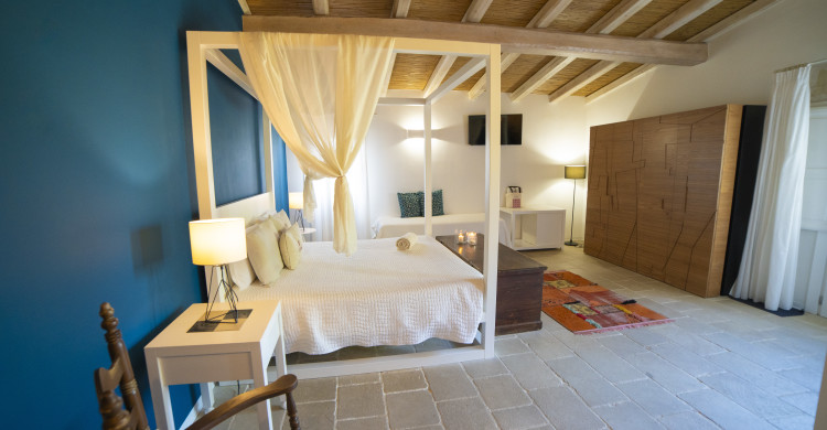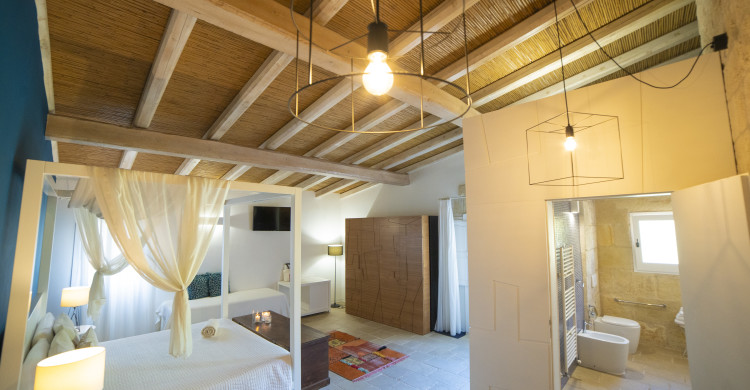 Our 40-square-metre Superior ANTICA TERRA room takes its name from the geometric designs on the furniture depicting the narrow streets of the historic centre of our town, Martano, which in the Middle Ages was called ‘Antica Terra’ (ancient land).