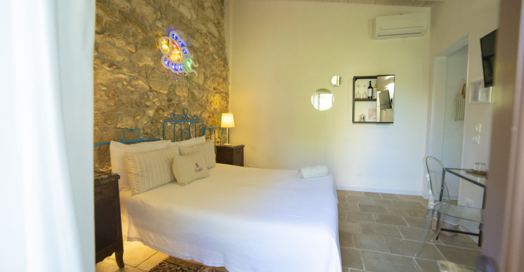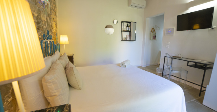 From its simplicity comes our PIETRAVIVA Superior Room, 20 square metres, living stone in the walls and a ‘cannizzo’ roof typical of our oldest tradition, made with skill and respect for past disciplines.