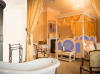 Gaze down through the large ocean-facing windows to watch the red squirrels play in the garden. On clear days, glimpse the sun kissing the sea. The rich orange and golden hues speak of the romance of a bygone era. The regal archway frames the intimate haven of a decedent roll-top bath and separate shower.