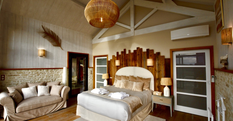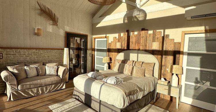 The king-size bed, adorned with luxurious linens, invites you to enjoy soft and serene nights, while the thoughtfully designed décor, in soothing tones, creates a warm and intimate atmosphere. Large windows flood the room with natural light, offering breathtaking views of the lush Périgord landscape, reinforcing the sense of calm and serenity.