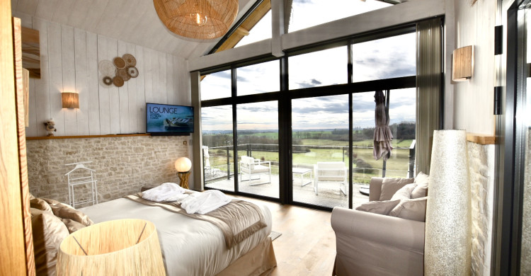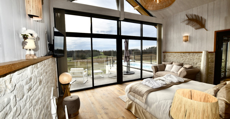 Terrasse privée : Espace extérieur intime avec vue sur la campagne, idéal pour des moments de complicité en pleine nature.