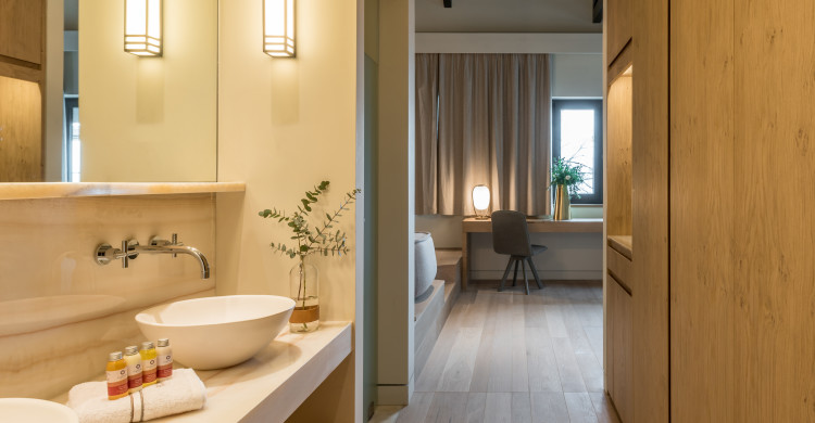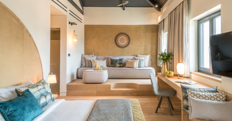 Room area: 53 m2 Style and dreamy sophistication The Euphoria Junior Suites exude style and sophistication, with all the mysticism of Euphoria Retreat combining with a sense of space and serenity across 53 square metres. An elevated seating area has been designed for you to relax in, allowing the day’s therapies to gently work their way through your body. The size and ambience of the Junior Suite will transport you on its own special journey of transformation, with the elegance of hand-chosen furniture and artwork combining with subtle lighting to set the perfect mood. Modern appliances and an audiovisual system are at your fingertips, allowing you to regulate every part of your stay. Pamper yourself The bathroom offers its own invitation to unwind, with a lavish design and Euphoria signature bathroom amenities, allowing you to choose between bathtub and shower. And from your balcony, you have a direct view to the citrus groves and village of Mystras, whose Byzantine architecture and iconography has inspired the design and colours of the room’s luscious textiles and elegant furnishings.