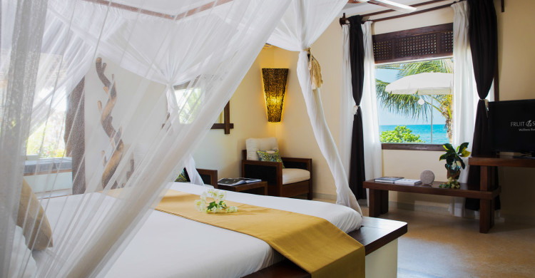 Our villa for honeymooners is ocean front, located on the furthest tip of the Fruit & Spice Wellness Resort offering the fullest privacy. Lovers can enjoy a private garden and a stretch of reef. The private access to reach the villa is one of the strong points of our facility. A gazebo with sunbeds and a personal spa pavillion complete the services provided with the villa.