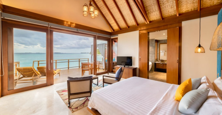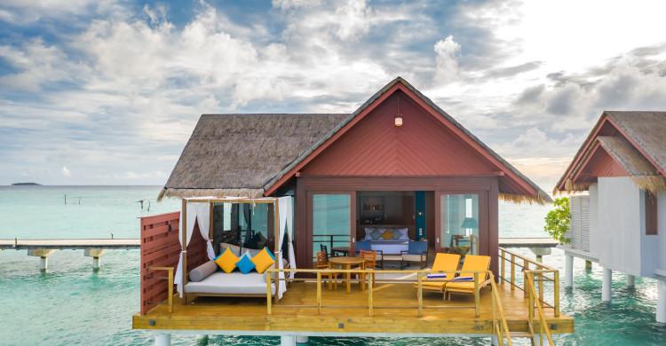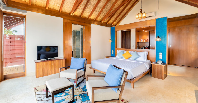 The Water Villas built in the turquoise lagoon are connected to the island by a wooden walkway which appears to float over the ocean waves. The spacious 98 square meters villas have been designed to give our guests pure privacy through an extended decked veranda with sun loungers and an outdoor dining area. The photos of the water villas and views are indicative only and may vary depending on room assigned. - 2 Adults & 2 Children / 3 Adults - 1 King Bed - 98 SQM