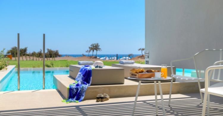 The Suite Private Pool Sea View of Gennadi Grand Resort will elevate your Rhodes holiday as they feature a private pool overlooking the sea for unforgettable summer moments. Moreover, the Suites feature a bedroom with a Double or Twin Bed, a sitting area with two single or one double sofa-beds, and a modern open plan bathroom.