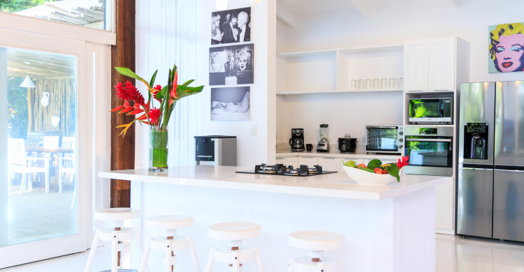 The villa boasts a master bedroom with a king sized bed and balcony, twin bedrooms with 2 queen sized beds and walk-in shower, and even a children’s room with 3 full sized sofa beds.