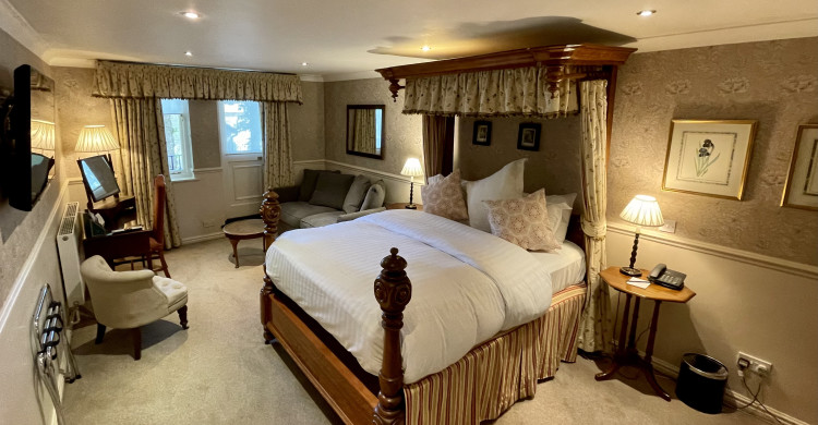 Our traditional bridal suite (room 40) offers a beautiful half-tester bed, Juliet balcony and ensuite bathroom.
