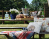Set above the grass on a wooden deck is the 5m canvas bell tent. Open plan layout with a king size bed and pocket sprung mattress. Fully furnished with bedside tables, wooden storage chests, Lloyd loom chairs with a side table and a clothes horse. Sheepskin rugs and carpets create a cosy environment, and several blankets are provided for extra warmth. A wood burner keeps the tent cosy if the summer evening turns cooler.