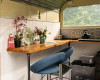A converted Rice Trailer provides you with all you need to create a tasty meal. Inside you have wooden worktops with 2 bar stools for indoor seating, at the end is a 2-ring induction hob and underneath the worktop there is a small electric fridge and charging point with USB inlets. All cooking equipment is provided. There is also a charcoal BBQ located outside next to the patio.